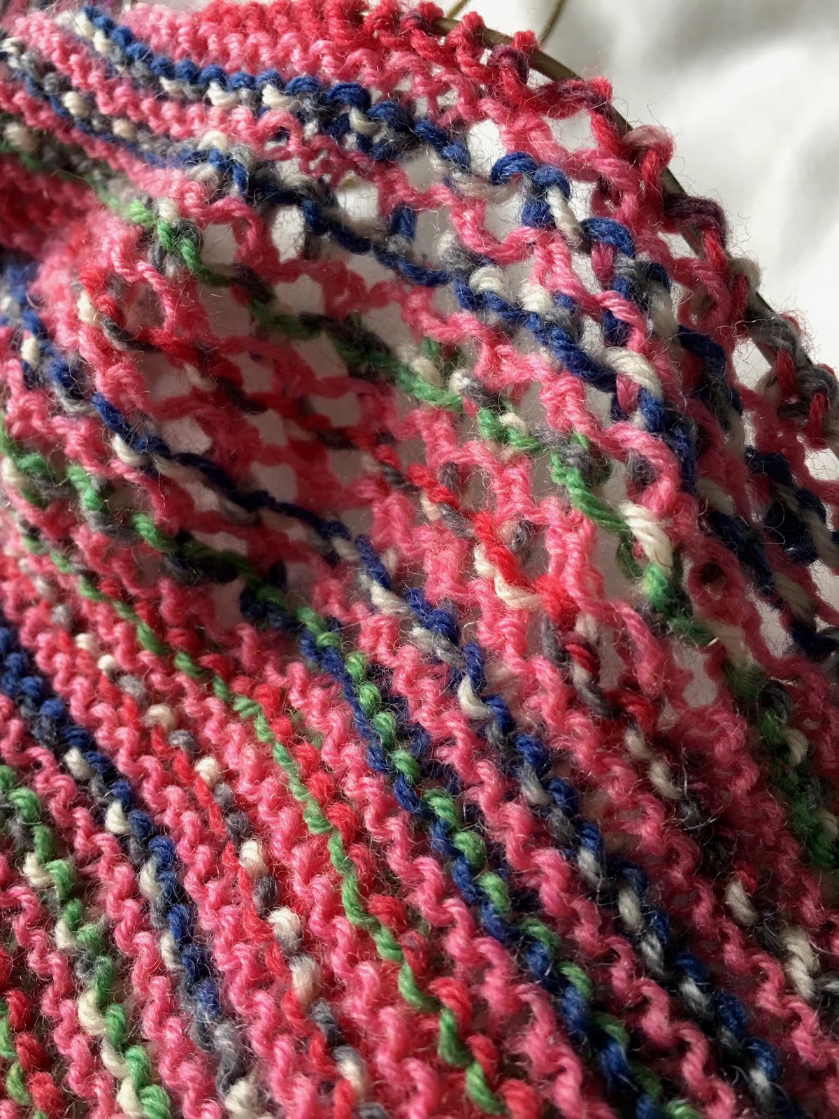 I took my crazy pink scarf I've been working on. I see that I haven't actually reported in about this before. It was sort of a palate cleanser after I finished my big grey shawl and it seemed to be a small project, but it has taken some time and, of course, has grown. It's not quite finished, but I'll give you some teasers!